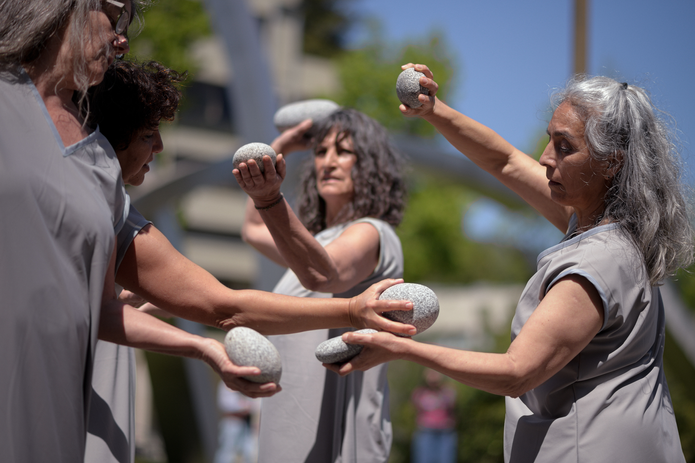Mediante la acción performativa, traemos la poéticas de las madera y las piedras como un gesto simbólico de curación y reparación. Despertando el amor compasivo, el cuidado, ternura, generosidad, reconocimiento y gratitud en honor a todas las mujeres, niñas, jóvenes, madres y abuelas que sufrieron violencia directa o indirecta, tortura, exterminio, exhilio ,y a aquellas que aún no pueden enterrar a sus seres queridos.